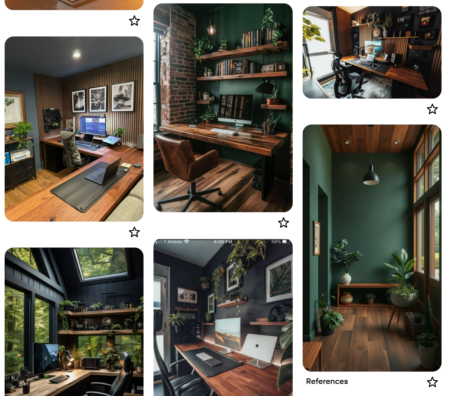 The idea started with a digital mood-board, a Pinterest board where I first stored photos of offices and office accessories which looked cool to me. After a few months filling this board, I could see a pattern of colors and materials of what I wanted. Dark (walnut), with dark green and acoustic panels was the common factor.