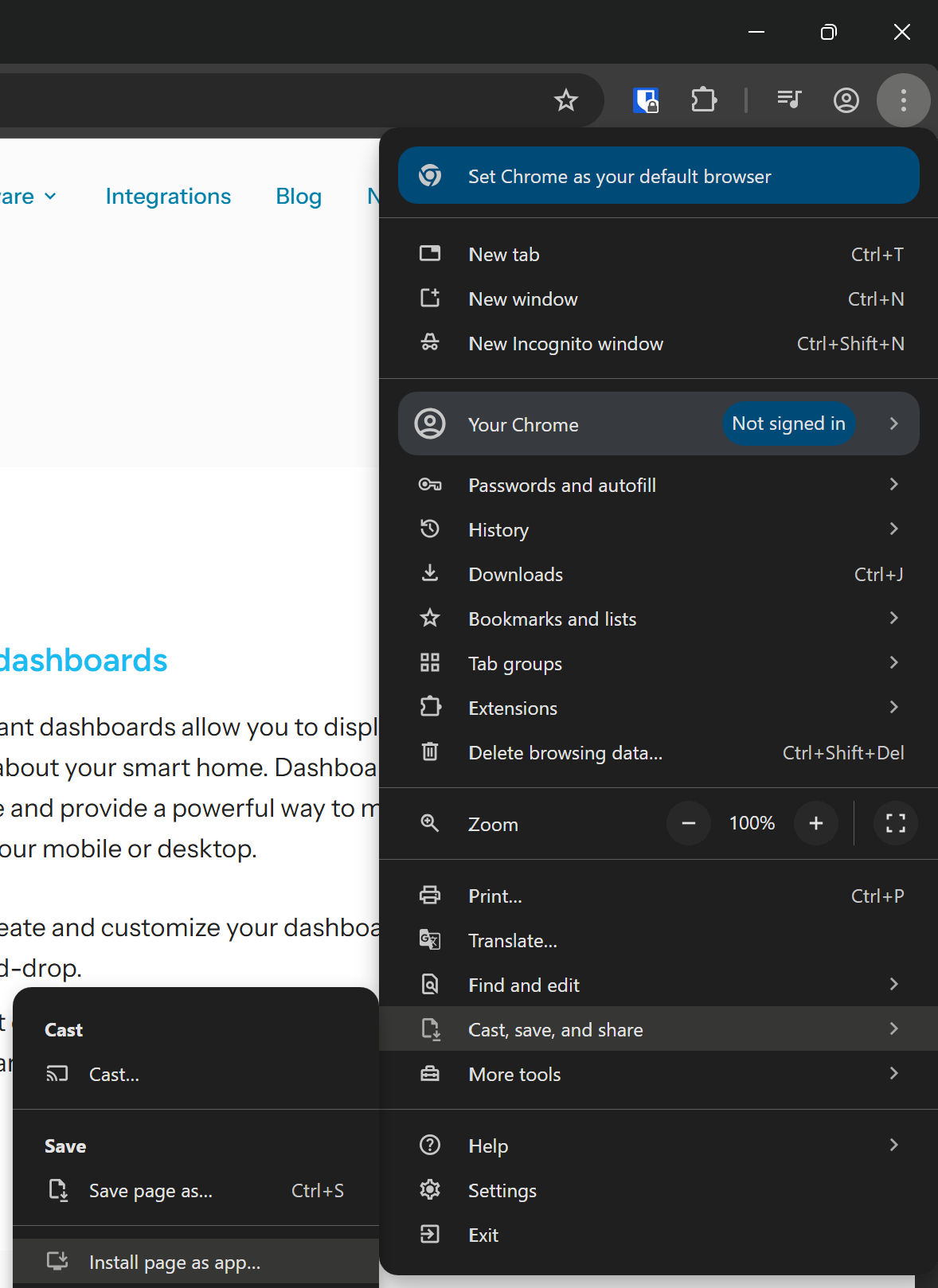 Go to the menu, select Cast, save and share, then select Install page as app....