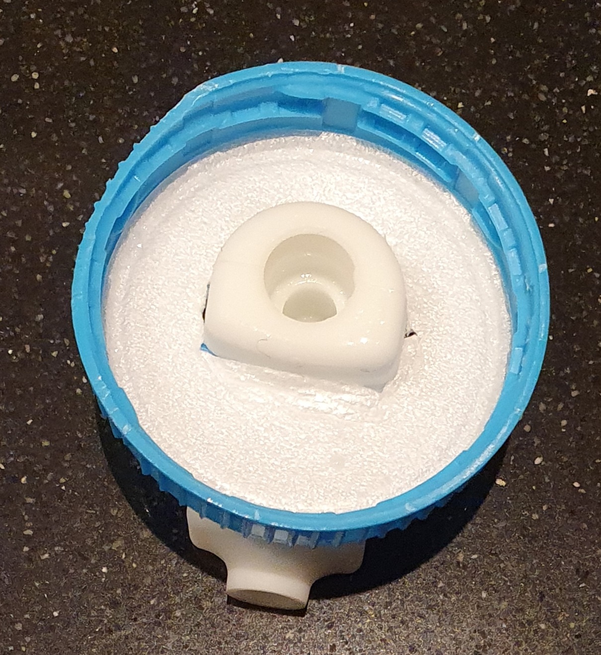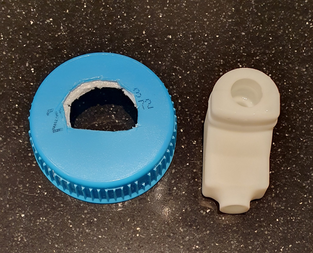 I used a screw top from an old bottle and drew the contour of the Jura milk adapter on it. Then I cut the shape of the adapter out of the cap with a stanley knife.