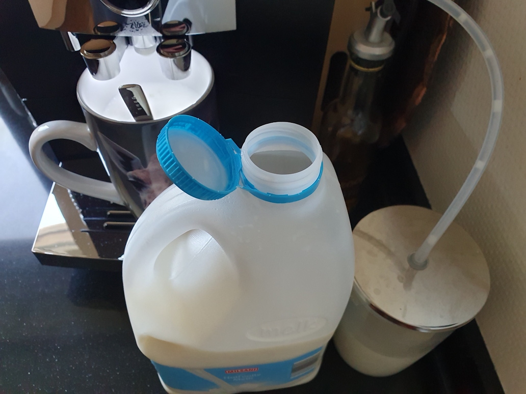 supermarket plastic milk bottle directly attached to a Jura coffee machine