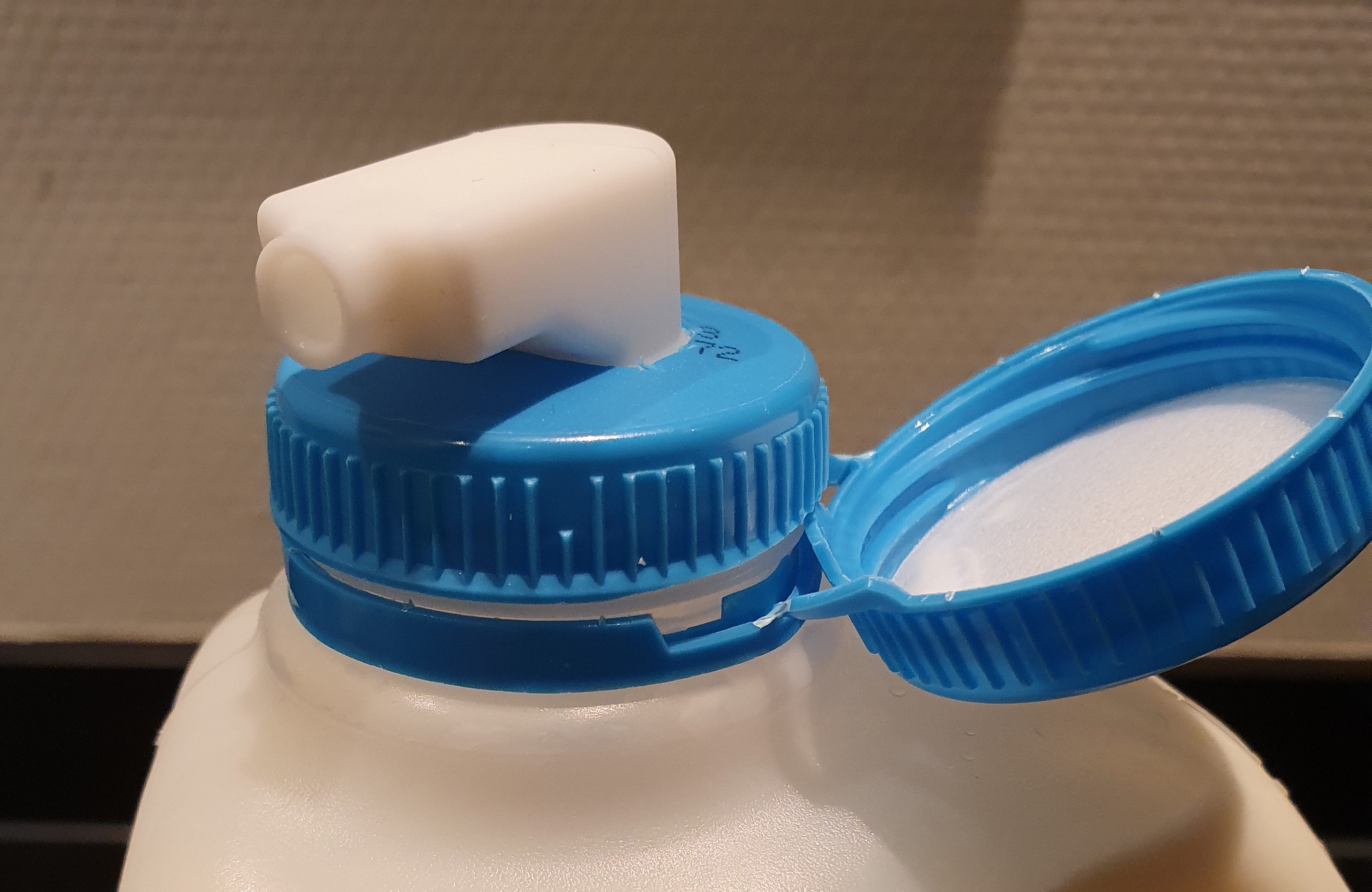 Starting the next phase. Creating a total solution. Now air comes in through the original milk bottle top, so I need to create a new top with the adapter build in the milk bottle top.