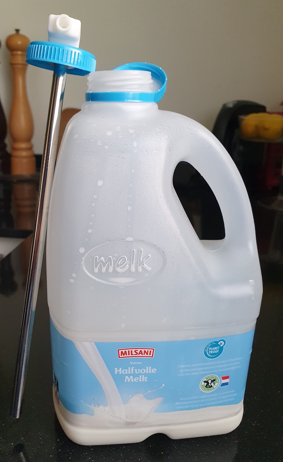 After testing this for a while with success, there was still some milk left over in the bottle. I still need a larger amount to decant the leftover milk to the next bottle. With a bit longer tube, I could reach the complete bottom of the bottle.