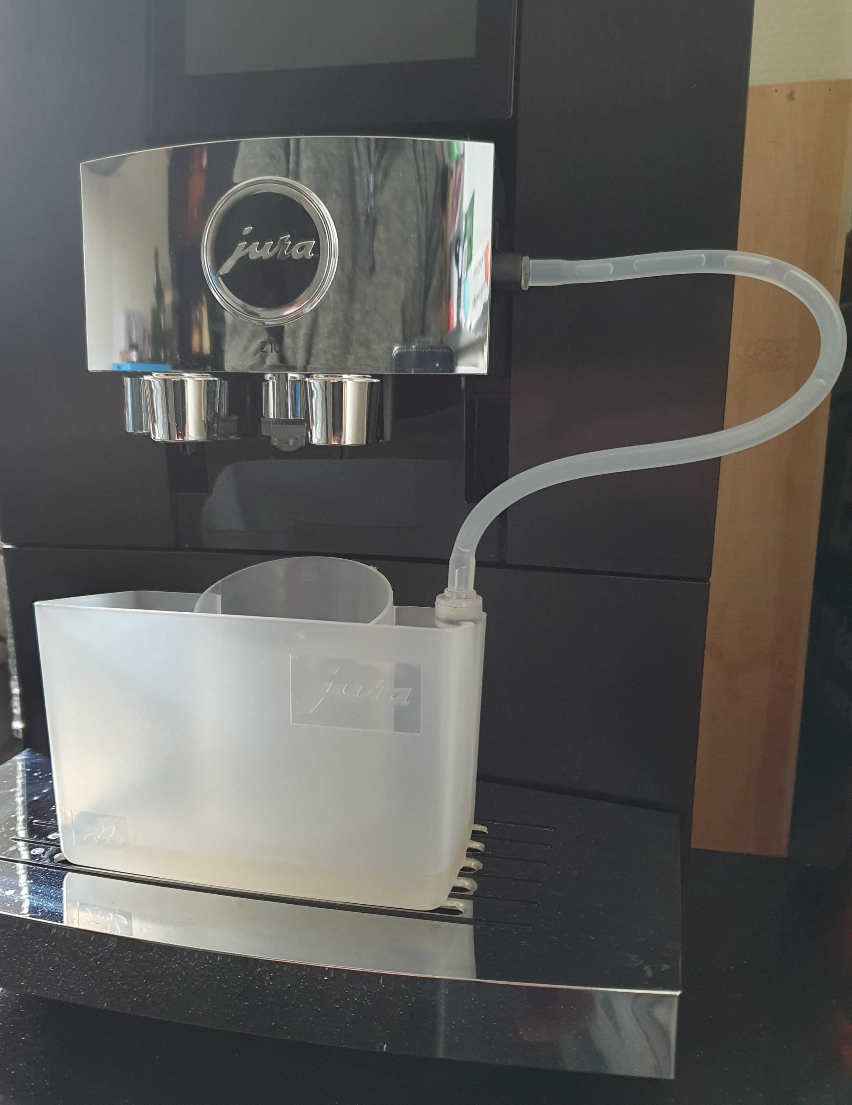 If you don’t want to spend too much money on the Jura Carafe, you can buy a long hoses and put this direct in an open milk bottle. The downside is that milk “sticks” to the outside of the hose when you get it out of the bottle, and you need to clean it direct to avoid dripping.